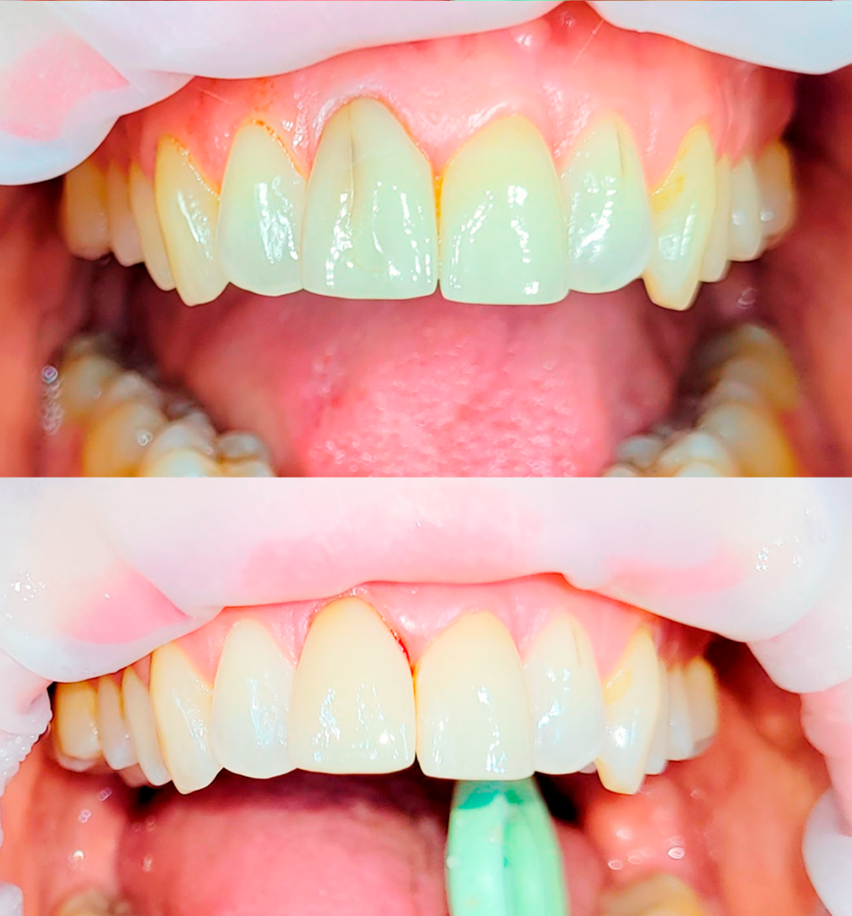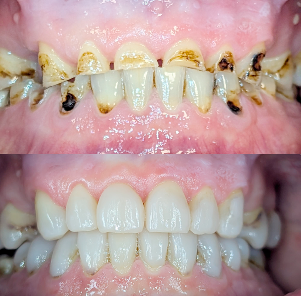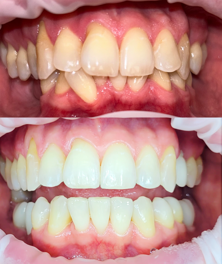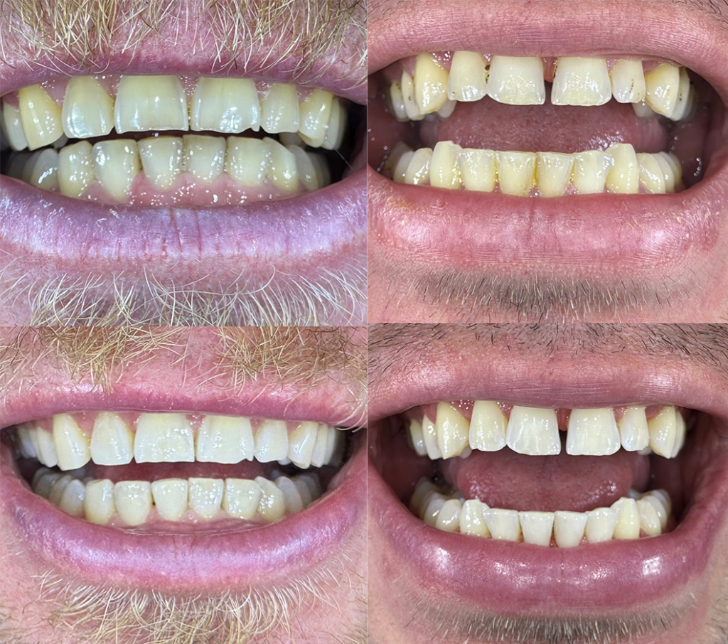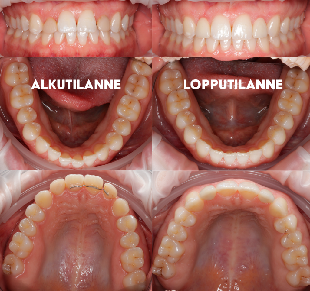 Hampaissa virheasentoja ja aukkoisuutta, joita korjattu oikomiskalvoilla. Laitimmaiset yläetuhampaat synnynnäisesti pienikokoiset ja niissä vanhat värjäytyneet yhdistelmämuovikruunut. Niihin oikomishoidon jälkeen on tehty kruununpidennysleikkaukset ja keraamiset kruunut. Kuvat: Hammaslääkäri Janne Säkkinen