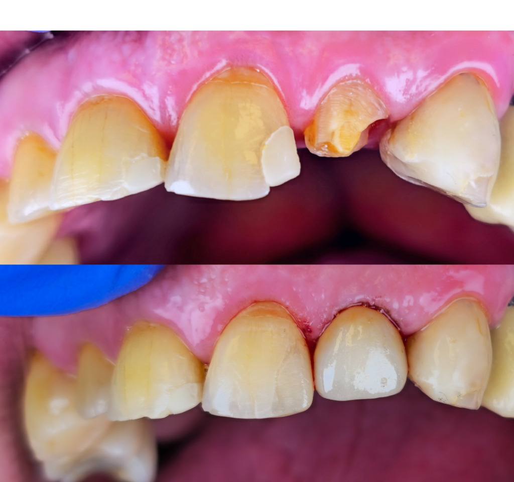 Kuvassa katkennut hammas korjattu keraamisella kruunulla ja naapurihampaan paikka vaihdettu. Kuva: Hammaslääkäri Esa-Pekka Juopperi