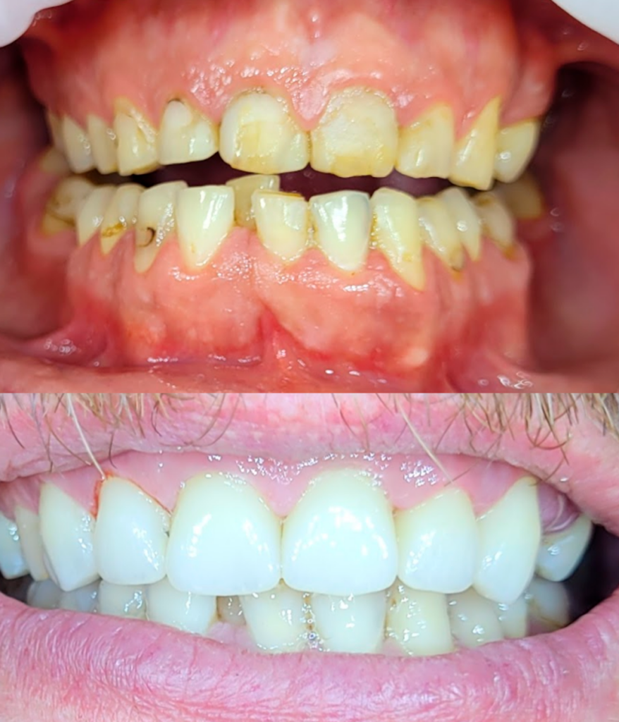Yläetuhampaiden kulumista, vuotavia täytteitä ja virheasentoja korjattu hammaslaminaateilla, samalla hampaiden sävyä vaalennettu selvästi. Kuva: Hammaslääkäri Ville Saarenpää