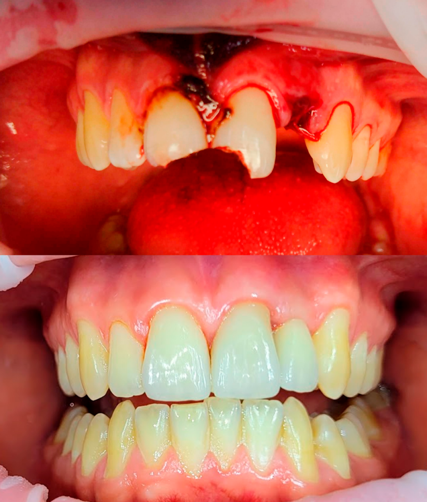 Urheilutapaturma, jonka seurauksena kolme hammasta vaurioitunut, joista yksi menetetty kokonaan, yksi jouduttiin juurihoitamaan ja kruunuttamaan ja yksi korjattiin hammaslaminaatilla. Kolme hyvin erilaistakin rakennetta voidaan saada sopimaan hyvin yhteen. Kuva: Hammaslääkäri Ville Saarenpää